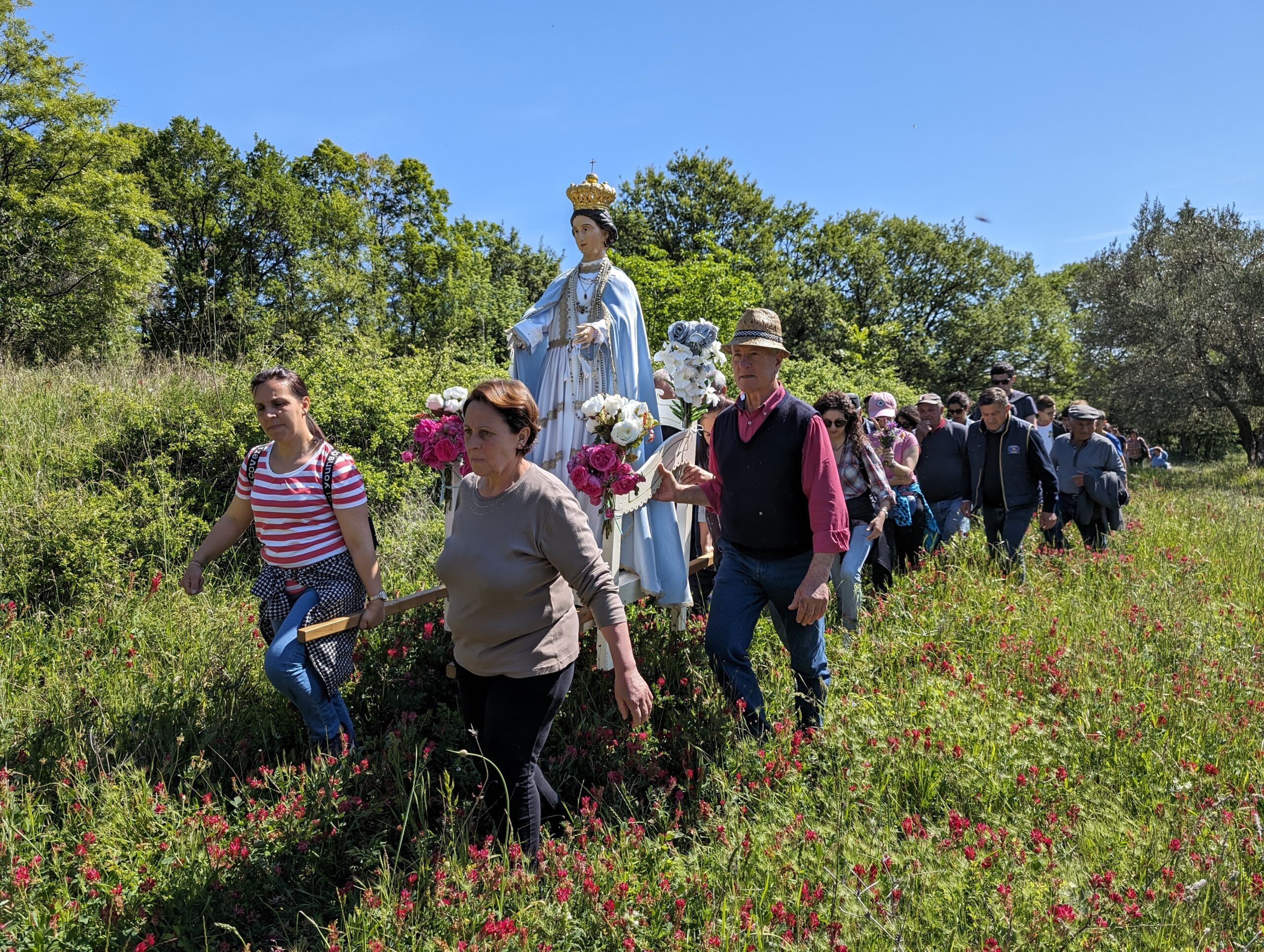 L’impervio tratturo percorso dai pellegrini, ricalca un arcaico tracciato fatto dai contadini che in passato si recavano a lavorare i campi coltivati della zona. Caratteristico, per l’occasione, il festoso addobbo floreale della sedia, realizzato con foglie e fiori di amaranto.