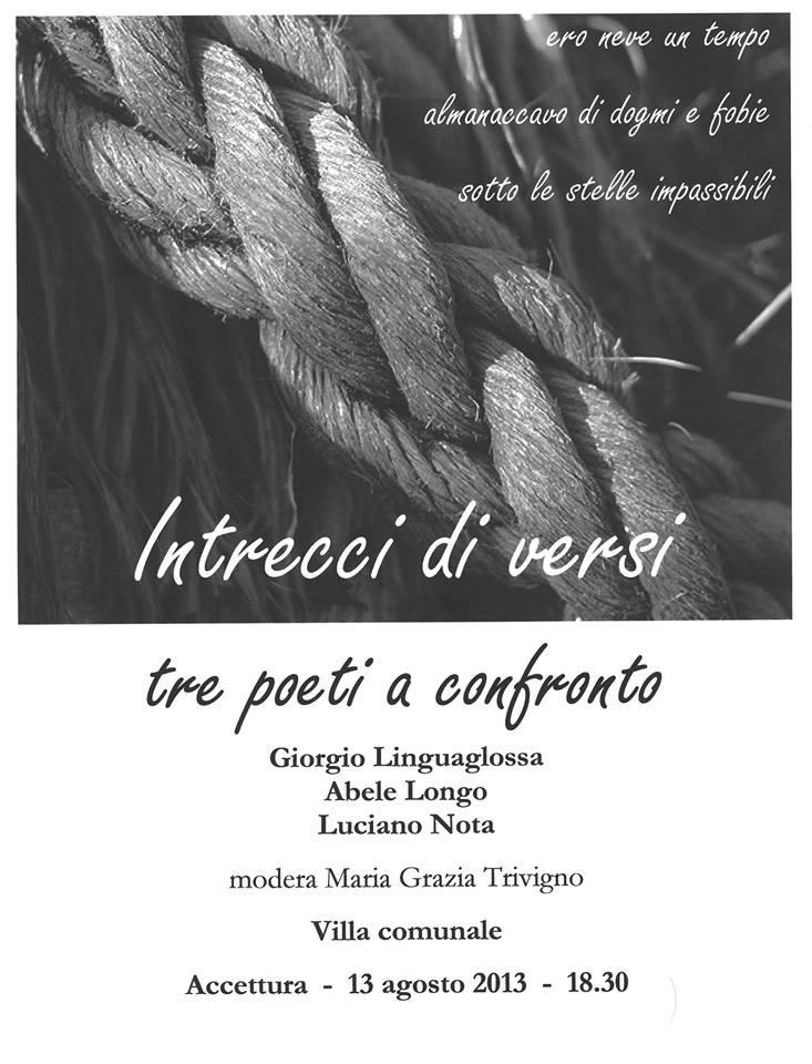 – ore 18.30 Villa comunale – INTRECCI DI VERSI, 3 poeti a confronto: Giorgio Linguaglossa, Abele Longo, Luciano Nota, moderati da Maria G. Trivigno (locandina)